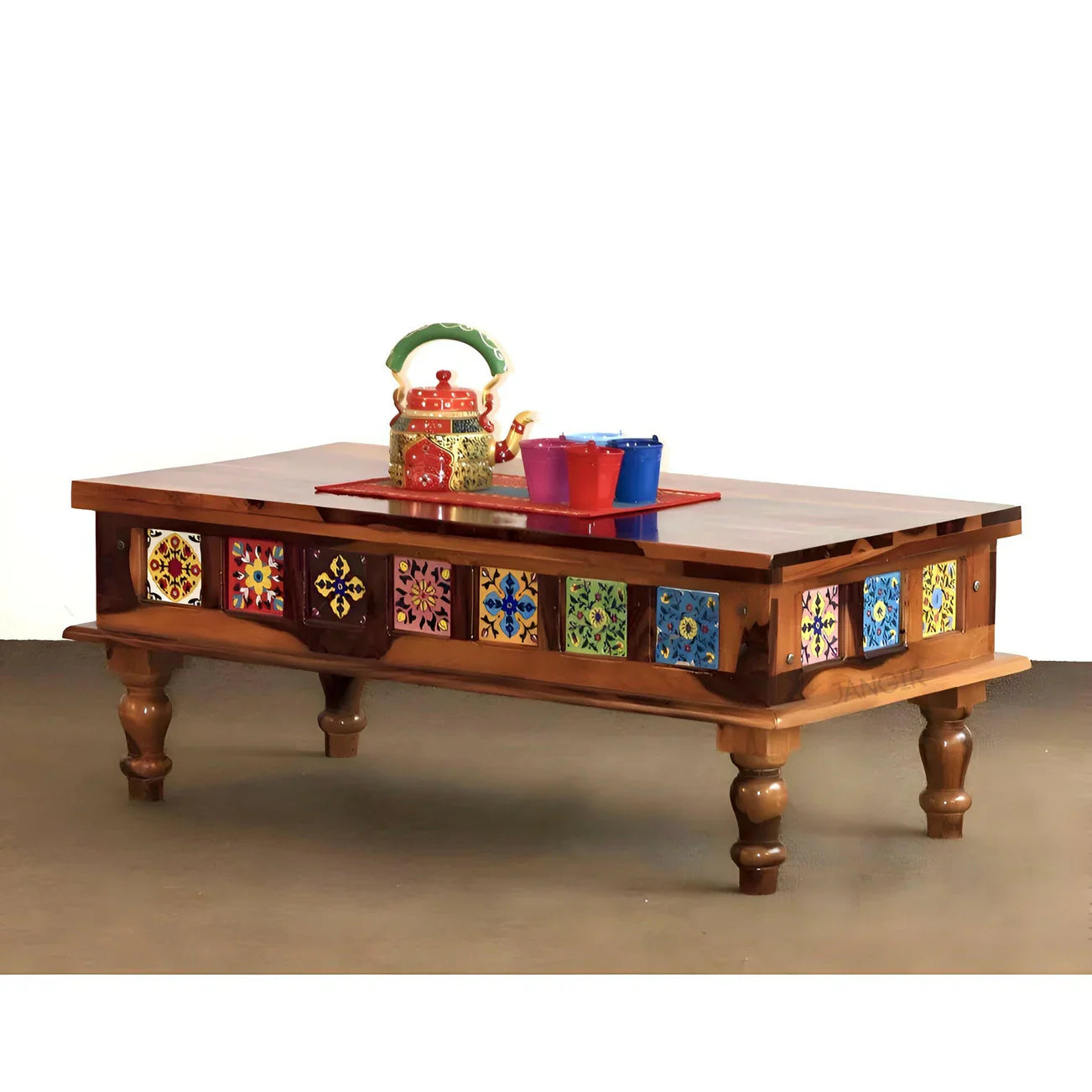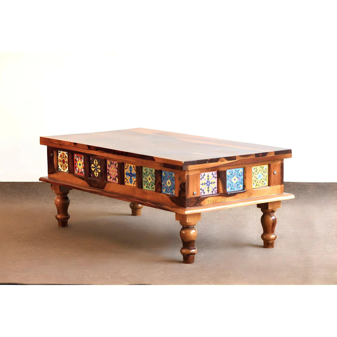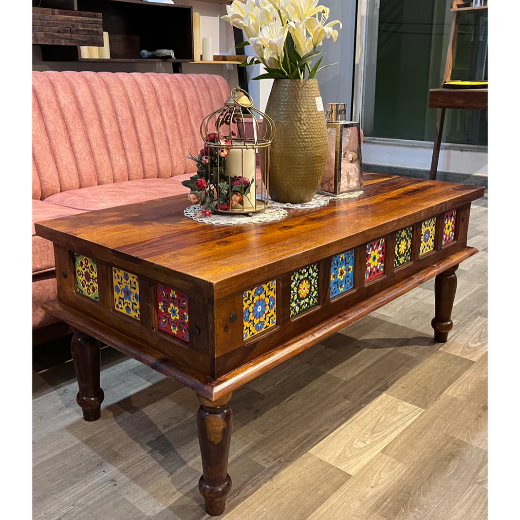 Elevate your living space with this beautifully designed wood coffee table featuring elegant ceramic tile inlays. A perfect blend of natural warmth and artistic detail, this piece adds both function and flair to any room.